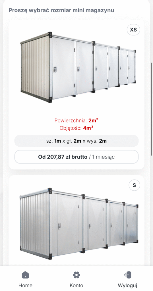 Po zalogowaniu wybierz opcję „Nowy mini magazyn” a następnie wybierz plac w Radomiu. Zobaczysz listę dostępnych rozmiarów boxów (np. 3m², 4m²). Wybierz ten, który najlepiej odpowiada Twoim potrzebom, klikając na odpowiedni obrazek. Pod każdym schowkiem znajdziesz informacje o wymiarach i pojemności.