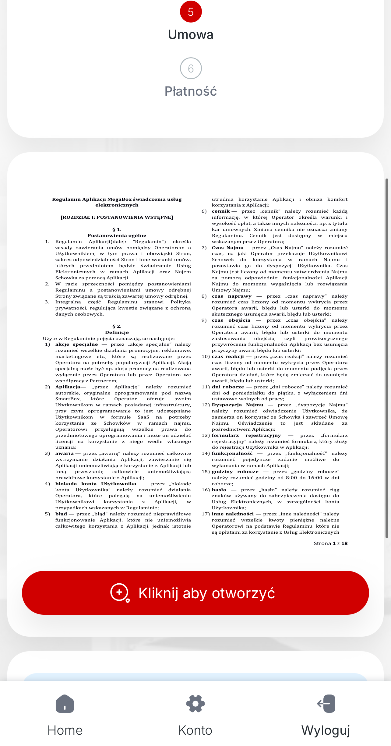 Otwórz umowę najmu i przeczytaj warunki. Zaakceptuj regulamin, aby przejść dalej.